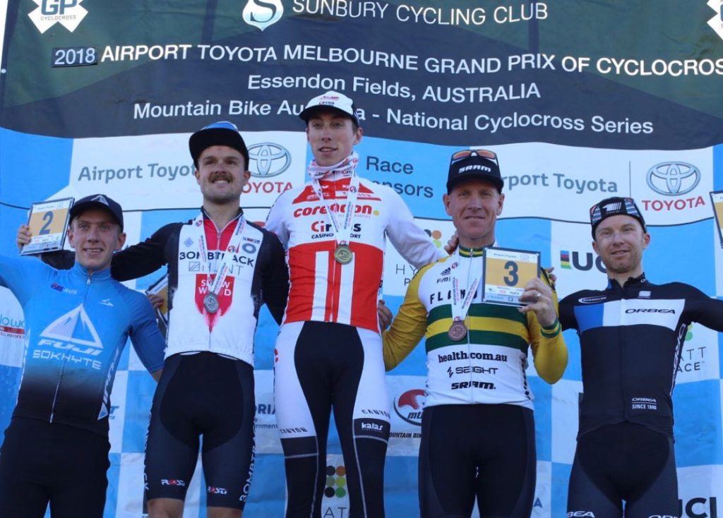 After his win in Adelaide Gosse made a road trip to Melbourne. This weekend he is competing in the Cyclo-Cross National Series (Round #8 & #9) – Fields of Joy CX, Essendon Fields – Victoria. The first race of the weekend ended on the podium.